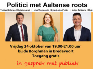 Aalten, oktober- Bij de komende Kamerverkiezingen staan maar liefst drie kandidaten geboren of afkomstig uit Aalten op drie diverse lijsten. Het gaat om Lisa Westerveld, huidig en kandidaat-Kamerlid van GroenLinks/PvdA, Arjan Tolkamp, Gelders Statenlid en 25ste op de lijst van het CDA en Tobias Holman, raadslid in de gemeente Aalten en 10e op de lijst van ChristenUnie. Een unieke gelegenheid om ze eens bij elkaar te brengen. Dat was het idee van de Aaltense wethouders Joop Wikkerink en Rik van Lochem die de datum van het werkbezoek van Lisa Westerveld aan de Achterhoek aanpakten om een mooi gesprek te organiseren bij de Borghman in Bredevoort. Het gesprek vindt plaats van 19.00-21.00 uur op vrijdagavond 24 oktober Wethoudersvragen. Wethouder Rik van Lochem: “Ik heb het onderwerp Jeugd in mijn portefeuille en daar heeft ”Den Haag“ een grote invloed op. Dus ik wil wel graag weten hoe de diverse partijen iets voor onze jeugd kunnen doen”. Joop Wikkerink vult aan: “We kunnen op lokaal niveau wel allerlei pleisters plakken als het gaat om bestaanszekerheid; de structurele oplossing, verhoging van de koopkracht moet toch uit Den Haag komen. Dus daarover gaan we de drie maar eens aan de tand voelen. Discussie met publiek. Natuurlijk krijgen de drie politici de kans iets over zichzelf te vertellen in relatie met Aalten en mogen ze het publiek ook duidelijk maken dat een stem op hen een goede investering is voor de komende regeerperiode. Het laatste onderwerp is weer wat meer verbindend: Hoe kijken alle drie naar de huidige stand van zaken in het land en dan vooral de sfeer van polarisatie, uitsluiting en geschreeuw en gescheld. Wat zijn hun ideeen om weer normaal met elkaar om te gaan? Locatie Partij voor de Bieren De locatie is uniek. De Borghman in Bredevoort ( op ’t Zand) is het hoofdkantoor van de Partij voor de Bieren. Gerco en Chiel verzinnen elk verkiezingsjaar weer een nieuw affiche en slogan. Voor deze verkiezing is dat ”Nuchter denken is een kunst”. Hoeveel dubbele bodems kun je hebben,…… Om het helemaal goed af te maken treedt de Achterhoekse bard Stef Woestenenk op in de tussen-blokjes en aan het eind. Iedereen welkom; gratis toegang, koffie gratis, drankjes voor eigen rekening, café blijft open na de discussie.