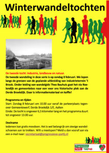 De tweede tocht: Industrie, landbouw en natuur. De tweede wandeling in deze serie is op zondag 8 februari. De eerste winterwandeltocht van Progressieve Partij/GroenLinks-PvdA was een groot succes. Zie de berichten op deze site. Op zondag 8 februari lopen we langs de grenzen van de geplande uitbreiding van industrieterrein ’t Brook. Onder leiding van wandelgids Theo Bauhuis gaat het via Roelendijk en gemeentebos naar een voor ons historische plek aan de Derde Broekdijk. Daar is informatiemateriaal en koffie! Waar precies is nog een verrassing. Programma en tijden • Start: Zondag 8 februari om 10.00 uur vanaf de parkeerplaats tegenover Gemeentewerf, Derde Broekdijk 1/E, Aalten • Einde: De tocht is ongeveer 6,5 kilometer lang en het programma duurt tot ongeveer 13.00 uur. Deelname Iedereen kan gratis meedoen. Het is wel belangrijk om stevige wandelschoenen aan te trekken. Wil je meelopen? Meld je dan vooraf aan via een e-mail naar: secretariaat@progressieve-partij.nl.