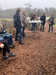 De ochtend begon sportief onder leiding van gids Theo Bauhuis. De tocht voerde de wandelaars door de modderige maar prachtige natuur van ’t Goor naar ’t Engeveld. Hier werd stilgestaan bij een succesvol voorbeeld van agrarisch natuurbeheer. In ’t Engeveld werken boeren, het waterschap en de overheid nauw samen aan natuurinclusieve landbouw. Dat dit zijn vruchten afwerpt, blijkt wel uit de vogelstand: er zijn inmiddels al 150 verschillende vogelsoorten geteld.