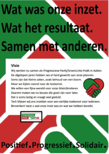 Met deze woorden in het achterhoofd laten we de komende weken zien waar we aan gewerkt hebben en wat er bereikt is, natuurlijk samen met anderen: onze partij, de fractie in de raad en onze wethouder met het college. Allemaal hebben we keihard gewerkt aan een betere wereld en onze eigen leefomgeving. Positief. Progressief. Solidair. Het gaat immers om mensen.