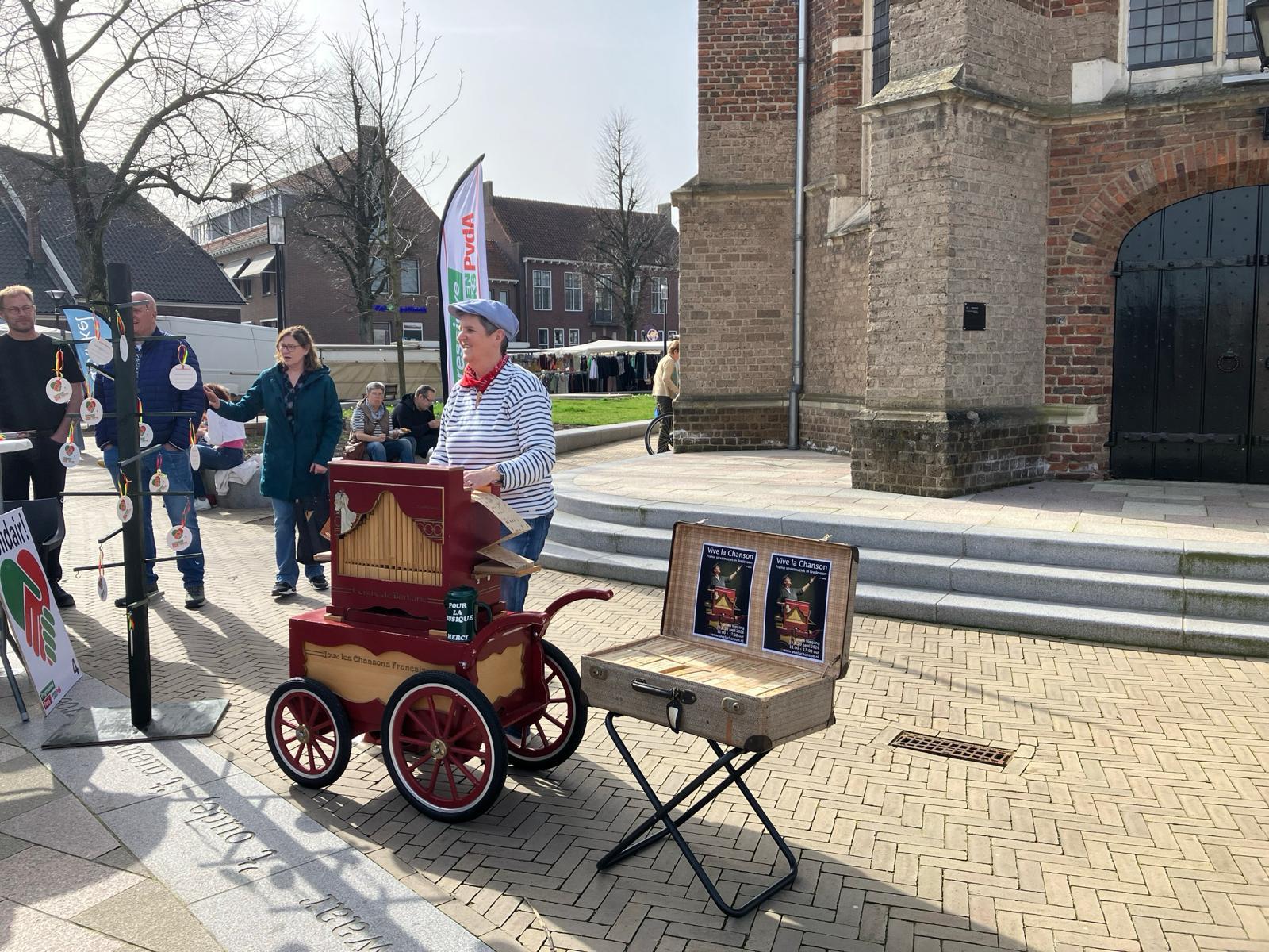 Vanaf 13.00 uur werden de martkbezoekers verrast met de vrolijke klanken van “orgue de barbarie” met orgeldraaier Xandra Storm. Dat bepaalde meteen de sfeer op deze zonnige vrijdagmiddag. De bezoekers waardeerden dit ook. De orgeldraaier hoefde niet “te mansen”; sommige bezoekers (veel Duitse gasten) gaven uit zichzelf een bijdrage.