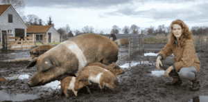 Voedsel moet eerst naar de mens, vindt ze, en dan pas als veevoer dienen, en moet niet worden weggegooid. Varkens zijn van nature zindelijk, en door hun manier van houden voorkomen ze goeddeels dat urine en mest met elkaar in contact komen, en daardoor het ontstaan van ammoniak. Dat verhaal horen we ook van de Coöperatie Zonvarken in Toldijk, waarover hier ook al wel eens is bericht.