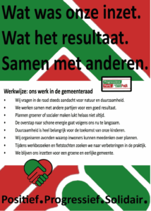 Met deze woorden in het achterhoofd laten we de komende weken zien waar we aan gewerkt hebben en wat er bereikt is, natuurlijk samen met anderen: onze partij, de fractie in de raad en onze wethouder met het college.