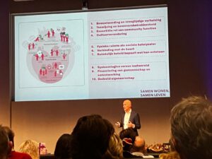 Vrijdag een mooie conferentie in het Achmea-conferentiecentrum in Zeist. Dat is een nogal imposant en luxe vergadercentrum opgezet door Achmea (daar vallen werkelijk zo’n beetje alle Nederlandse verzekeringsmaatschappijen onder – zie foto). “Van onze premie”, hoor ik sommige mopperaars al zeggen. Vind ik eigenlijk ook wel. Positief is dat al die geldverdienende verzekeraars ook zeker (wellicht uit welbegrepen eigenbelang) wel oog hebben voor nieuwe vormen van bouwen en leven. “Bouw geen huizen, maar gemeenschappen”, een uitspraak overgenomen van de vroegere Rijksbouwmeester van Nederland: Floris Alkemade. Op dit congres werd daar over nagedacht. Met key-note van Lodewijk Geluk (directeur VNG), waarin het nieuwe kabinet nogmaals tot spoed gemaand werd om de lange lijnen te verduidelijken: in welk Nederland willen we leven? Joris van Eijk (van de Raad voor de Volksgezondheid) met alarmerende cijfers over een oud-wordend Nederland, maar ook met oplossingen, als we maar willen. En daarna in deelsessie naar mooie voorbeelden. Ik zat bij Thuishuis (Woerden) en de Kastanjetuin Zwolle. Stuk voor stuk mooie concepten die uitvoerbaar zijn. Mits de politieke wil er is. Het boek met de 17 mooie voorbeelden (voor Aalten de Kattenberg) werd aan het eind aangeboden.