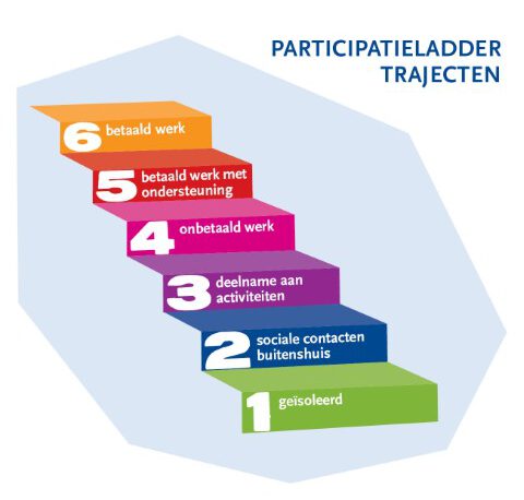 Samen met Laborijn heeft de gemeente Aalten ingestoken op het systeem “simpel switchen”. Kort en goed gezegd: om op de juiste plek in je leven op de arbeidsmarkt te belanden is het wel eens goed dat je af en toe switcht van plek, hulp, ondersteuning en “regeling”. Soms is voor mensen vier dagen arbeidsmatige dagbesteding het maximum, soms is een uurtje naar een inloop voorziening al het maximum. Soms kunnen mensen prima 3 dagen per week aan het werk, maar moeten ze dan twee dagen “uitblazen” op een beschutte plek. En al die werkplekken, dagbesteding, scholing worden geregeld vanuit verschillenden wetten en regelingen. Wat zou het mooi zijn als we daar nou eens door heen konden breken en dat je als inwoner met een hulpvraag stapjes zou kunnen maken op die participatieladder (zie plaatje) maar dat je ook als het nodig is, weer even een stapje terug kunt doen. Daarvoor moeten een paar mensen om tafel: de wmo-consulent, de participatiecoach, de jobcoach en de inkomensconsulent. Samenwerken dus en de beste oplossing voor de beste plek voor de inwoner ontwerpen.