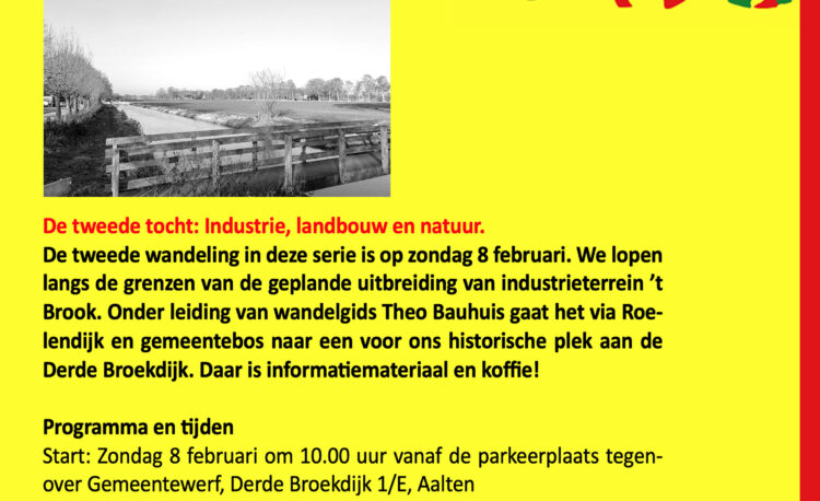 De tweede wandeling in deze serie is op zondag 8 februari. We lopen langs de grenzen van de geplande uitbreiding van indsutrietrrein ’t Brook. Onder leiding van wandelgids Theo Bauhuis gaat het via Roelendijk en gemeentebos naar een voor ons historische plek aan de Derde Broekdijk.Daar is informatiemateriaal en koffie!