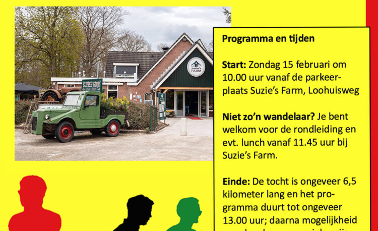 • Start: Zondag 15 februari om 10.00 uur vanaf de parkeerplaats Suzie’s Farm, Loohuisweg