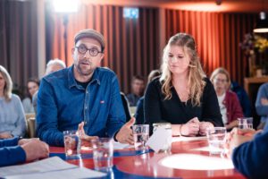 Mooi was dat de inwoners, deelnemers, zèlf aan het woord kwamen. Zo was er een jonge dame die heel knap haar persoonlijke situatie beschreef en er met het maken van gedichten uit kwam, een mevrouw die depressief was, maar nu voor het hele dorp taarten bakte, een andere mevrouw die al vijftien jaar spelletjes ontwikkelt, waarbij deelnemers aangemoedigd worden om te praten over hun problemen en een meisje dat bezig is een hulphond op te leiden en ook in te zetten bij bijv. jongeren met een adhd-stoornis. Hieronder wat foto’s van de rondetafelgesprekken (in de vorm van een hart).